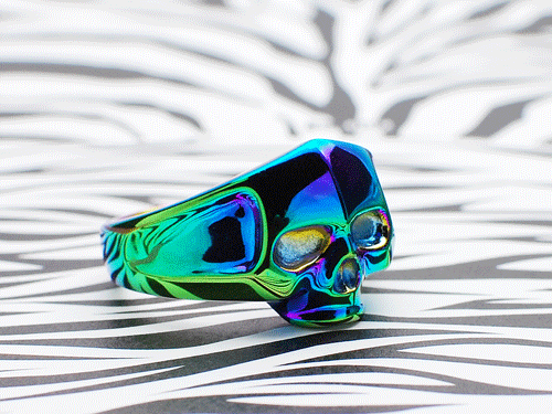 スカルデザインだからこそ、このレインボーカラーが映えるのですがチタンコーティングの特殊な技術の中で生まれたものなので、1点、1点お色味が変わりますのでご了承くださいね。
