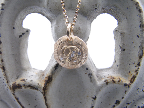 手彫りのイニシャルにダイヤモンドを施し、そのイニシャルの後ろには