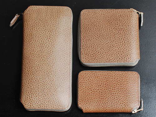左よりロングジップウオレット、右上はスクエアウオレット、右下はショートジップウオレット。(全て各1点の入荷)