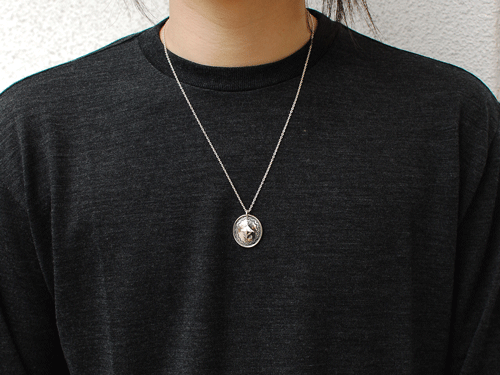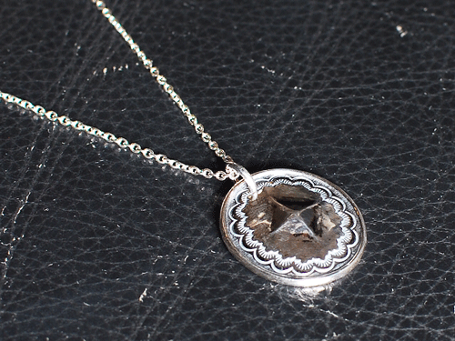 オーバルのプレートにネイティブ調のタガネを打ち込み、スタッズを中央にデザインした、エンドらしい温かみとスタイリッシュさが同居するネックレス(16000)