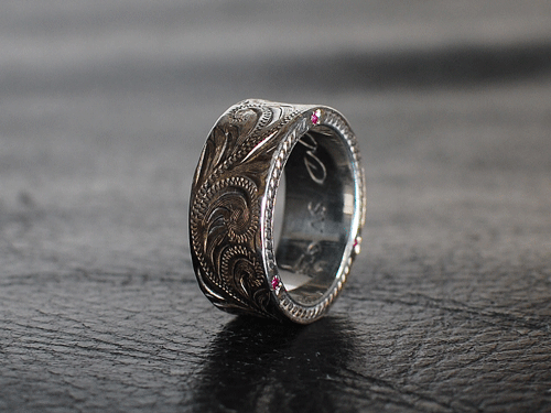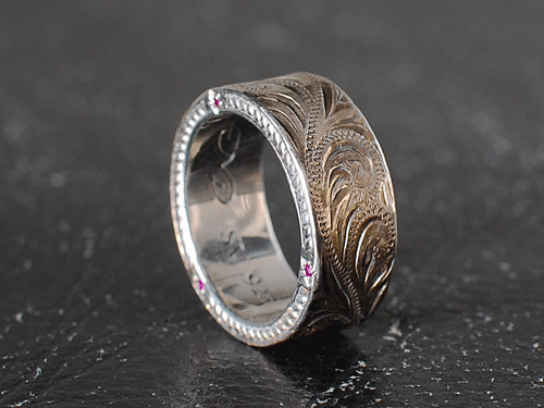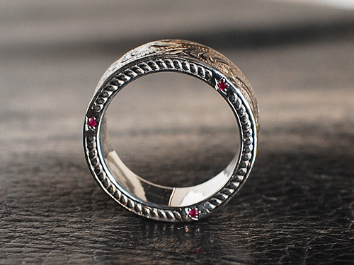 サイド両面にツイストレッグなデザインを彫り、天然のルビーをスターセッテイングしています(40000)