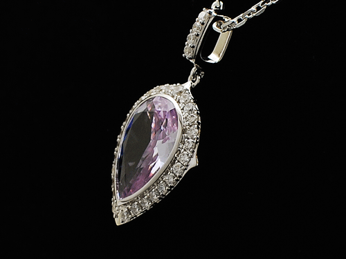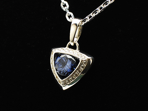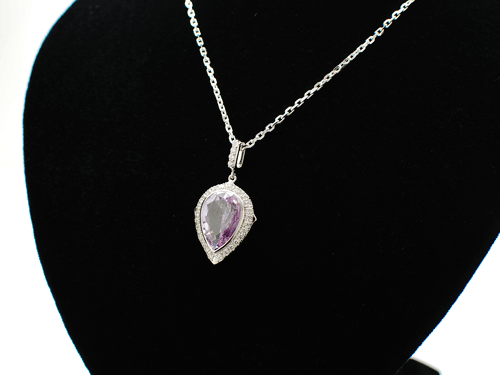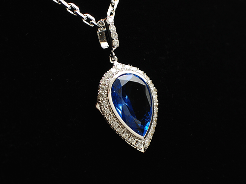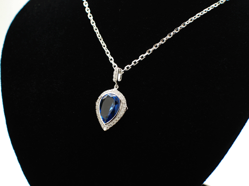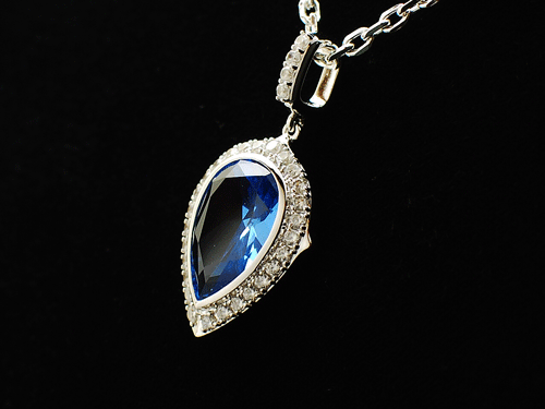 ブルースピネルのペアシェイプストーンの周りを包み込むように、ジルコニアをパヴェセッテイングした上品なオーラを漂わせるネックレス。