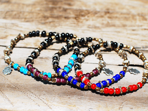 ホワイトハーツ、シードビーズを3パートに組み上げたブレスレットで、ターコイズブルー、パープル、ブルー、レッドの展開です(4000)