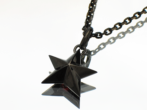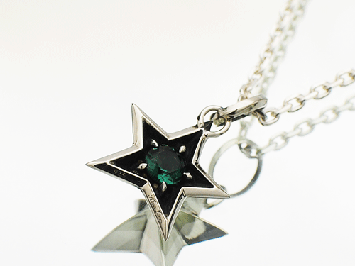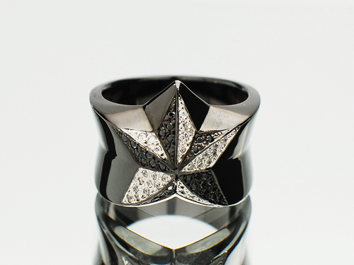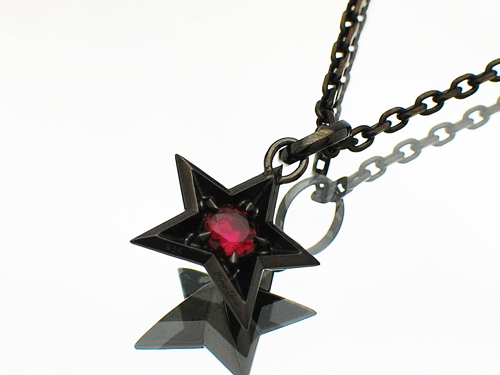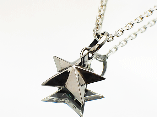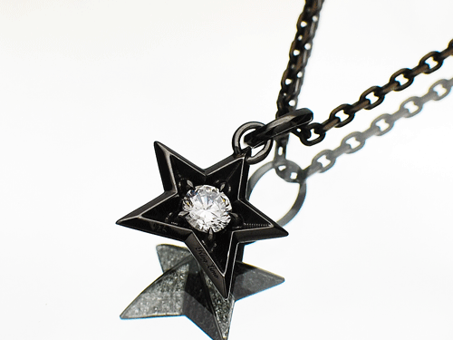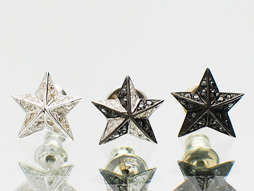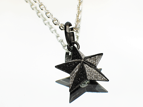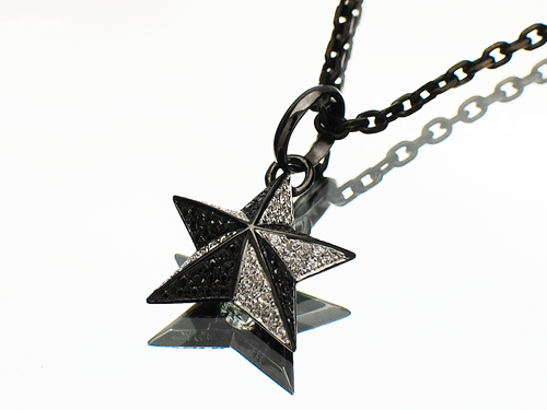 立体感のあるシルバーの星にクリアーとブラックのジルコニアを全面にセッティングした後、ロジュームコーティングを施します。
