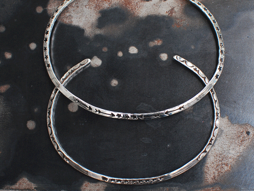 厚さ約1,2mm程のシルバープレートにスタンプを施した、軽くてとても着けやすい平打ちのバングルです。