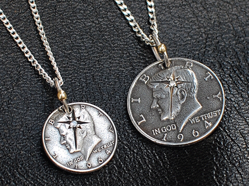 同じくリングはシルバー925製で、ブラス(真鍮)製の15mmケネディコインはシルバーコーティングが施され、頭部にはダイヤモンドが彫り留めされています。(13000)