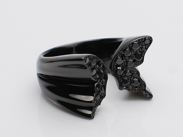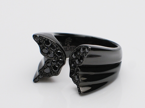 ◆ハネ部分にブラックキュービックジルコニアを敷き詰め、さらにブラックコーティングを施した黒艶の仕上がりです。