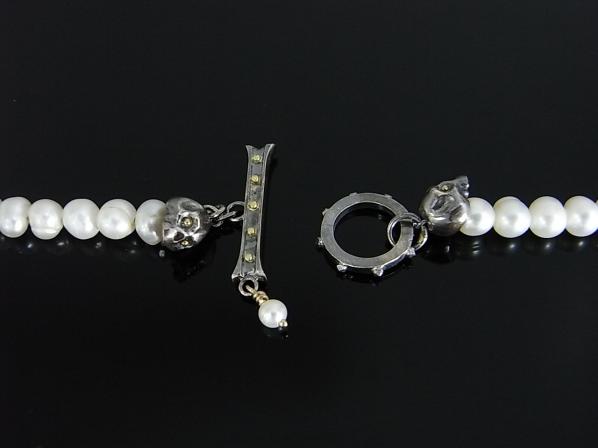 ホワイトパールが連なるネックレス。トップを通すことはもちろんの事、スカルヘッドを胸元に演出しても良い。