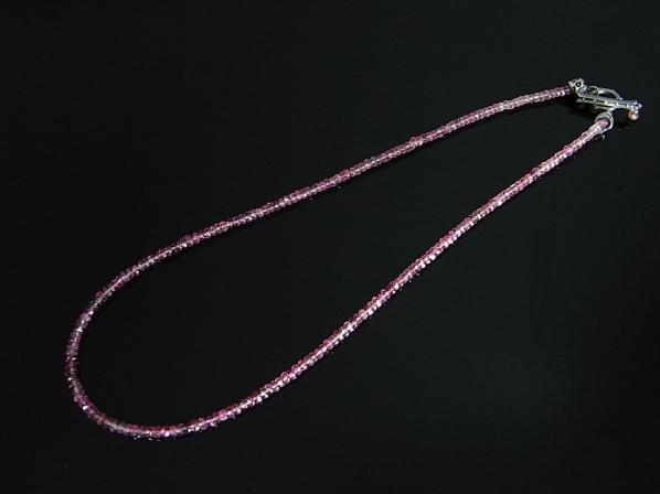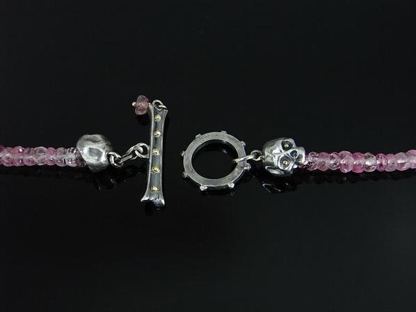 ピンクトルマリンが連なるネックレス。トップを通すことはもちろんの事、スカルヘッドを胸元に演出しても良い。腕にまわしてブレスレットにも。