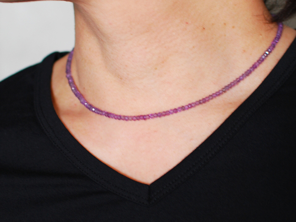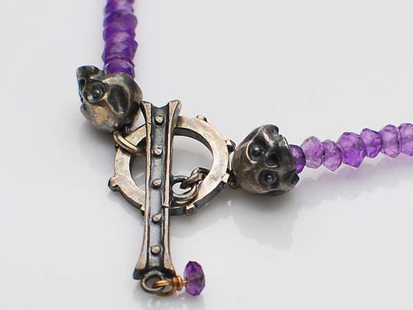◆アメジストを連ねた優しい色味のネックレスで、エンド部分には極小のスカルが施されています。