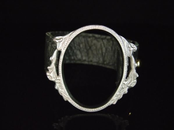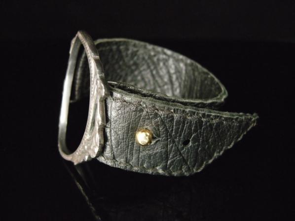 細部にまでこだわったシルバー部分と、贅沢なオーストリッチを使用レザーブレスレット。手首が見えるデザインになっている。