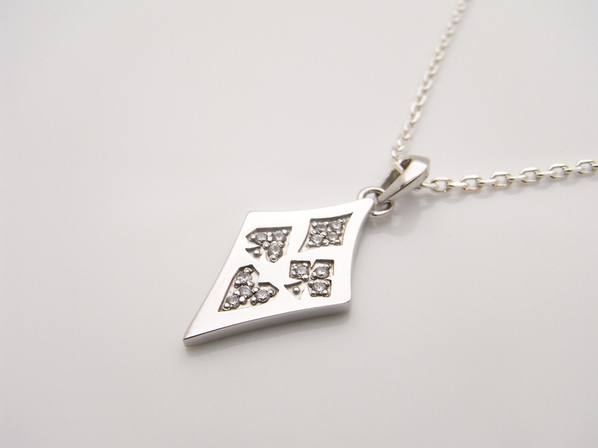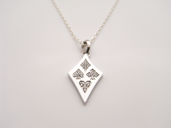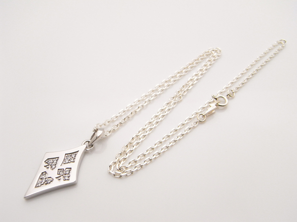 ◆ダイヤ型のフォルムに、トランプのスペース、ハート、クローバー、ダイヤをキュービックジルコニアでセッティングしたシンプルでコーディネートがしやすいネックレスです。