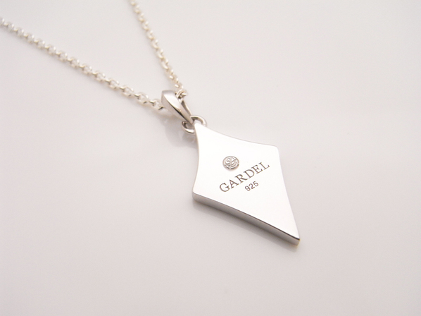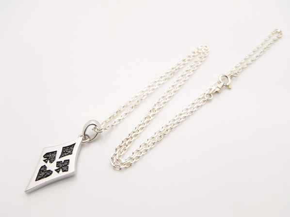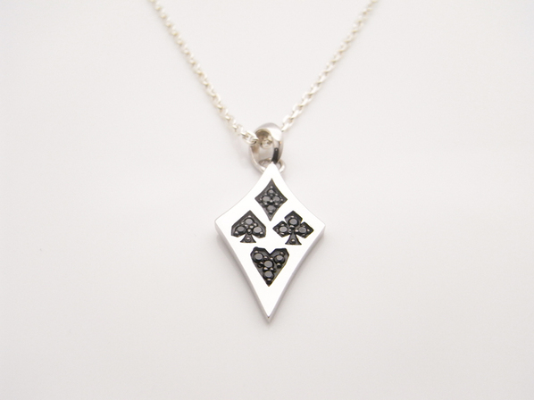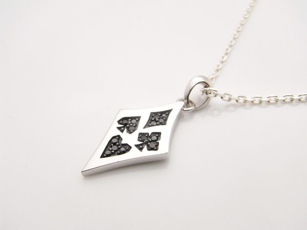 ◆ダイヤ型のフォルムに、トランプのスペース、ハート、クローバー、ダイヤをブラックキュービックジルコニアでセッティングしたシンプルでコーディネートがしやすいネックレスです。