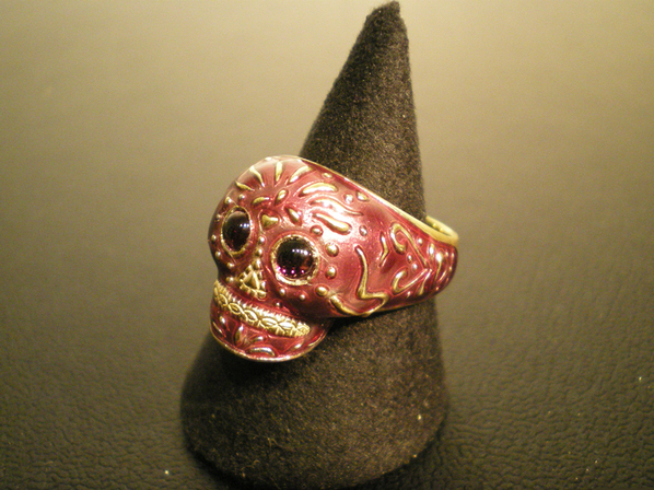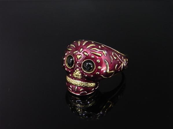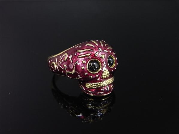 ◆シルバーのスカルをワイン色のエナメルでコーティング、眼にはロードライトガーネットを施した仕上がり。