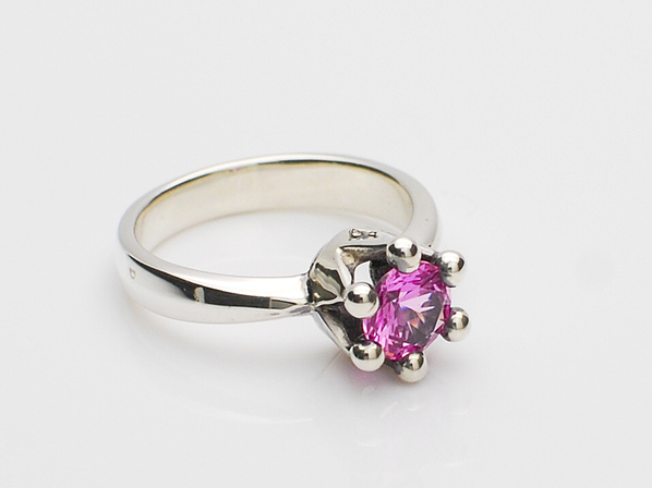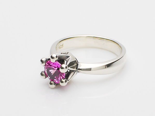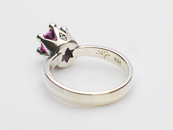 ◆シンセティックピンクサファイアが浮いた状態でセッティングされている為、通常よりも光が多く差し込み、王冠のもつ煌びやかさと華やかさを石の輝きで表現したリングとなっています。