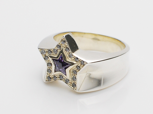 ◆星型にカットしたパープルのキュービックジルコニアを中央にセッティングし、その周りにキュービックジルコニアを敷き詰めた贅沢な仕上がりのリングです。