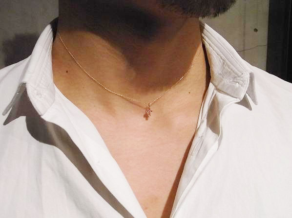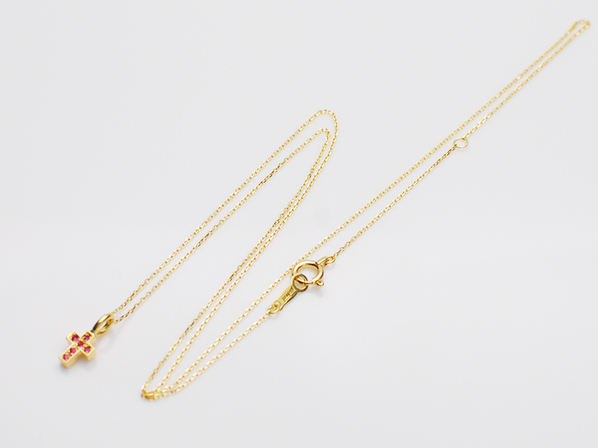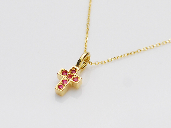 ◆18金イエローゴールドの極小クロスに、ルビーが6石セッティングされたネックレスです。