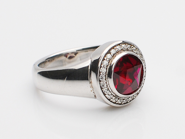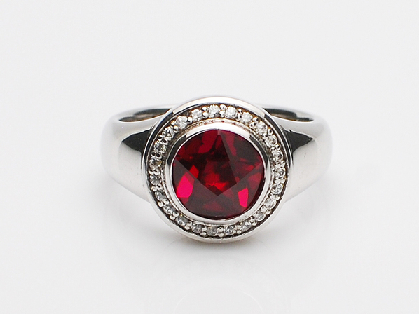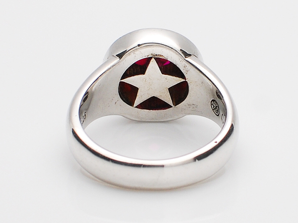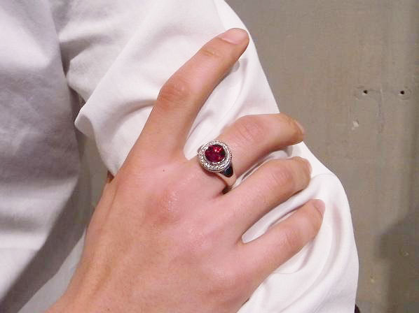 ◆表面を星形にカットしたシンセティックルビーを取り囲む様に、キュービックジルコニアを繊細にセッティングしたリングになります。