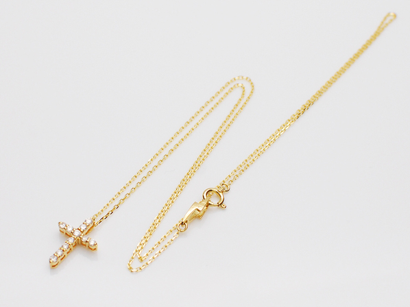 ◆定番で小ぶりなK18イエローゴールドのクロスに、ダイヤモンドを11石セッティングした高級感のあるネックレスです。