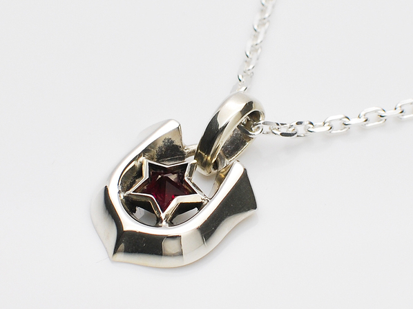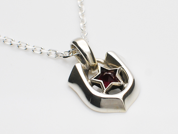 ◆くぼみの中に幸運を貯め込むと言われるホースシュー(馬蹄)をモチーフに、スターカットされたシンセティックルビーを配したペンダントヘッドです。
