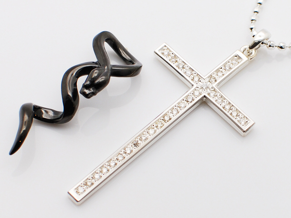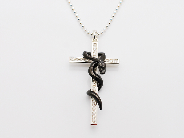 ◆贅沢にダイヤモンドを31石パヴェセッティングしたクロスに、躍動感のあるスネークが巻き付いたペンダントになります。