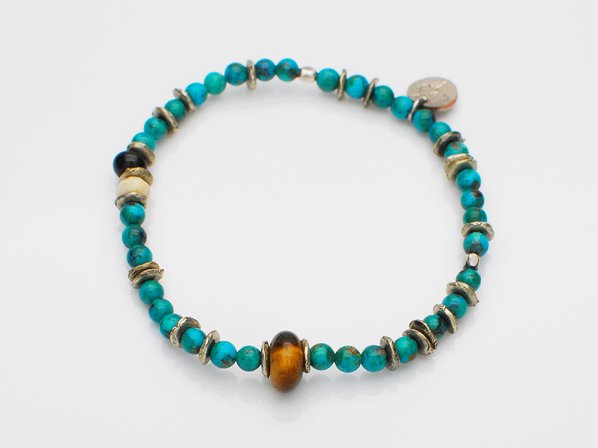 ◆ターコイズをメインに、タイガーアイ・ホワイトリバーストーン・ブルータイガーアイを組み合わせた、数珠タイプのゴムブレスレットです。