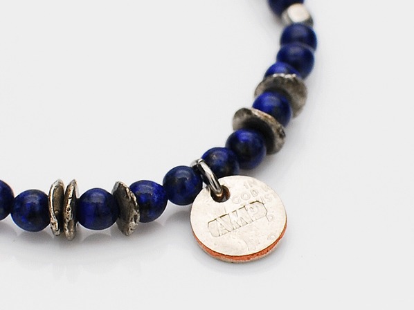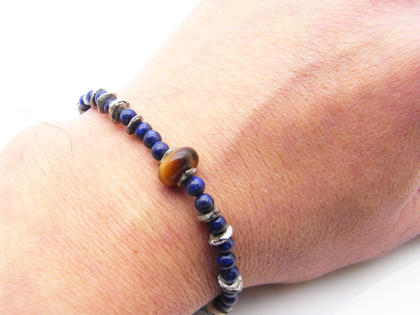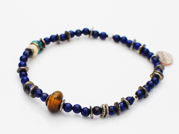 ◆ラピスをメインに、タイガーアイ・ホワイトリバーストーン・ターコイズを組み合わせた、数珠タイプのゴムブレスレットです。