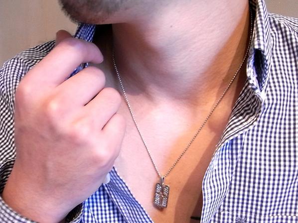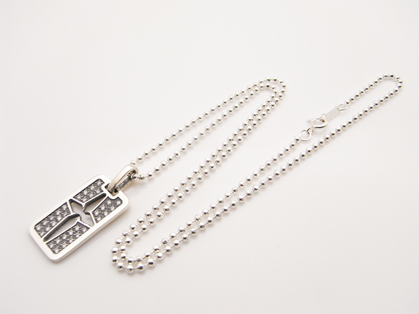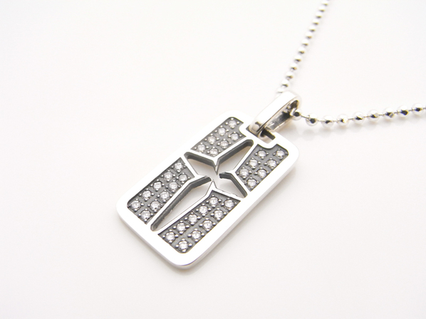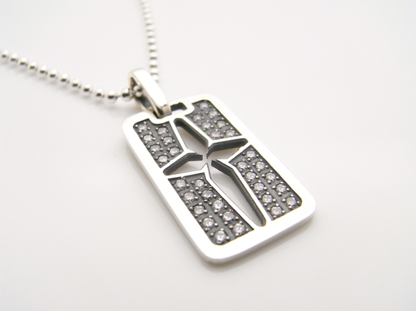 ◆小ぶりなドックタグに、ジルコニアをパヴェセッティングすることで、ハードになり過ぎず上品な仕上がりに。