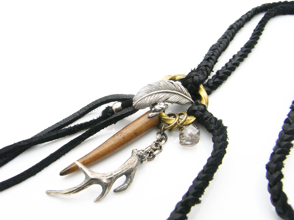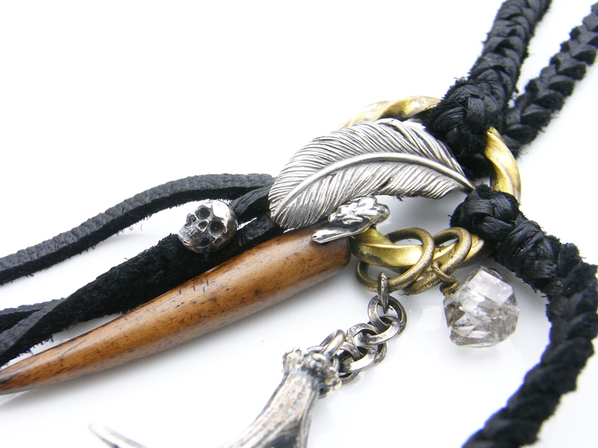 ◆バッファローホーンや、‘ダイヤモンドの原石’とまで言われる希少なクオーツ「ハーキマーダイヤモンド」などを組み合わせたネックレスで、チャーム一つ一つにネメシスのこだわりが感じられます。