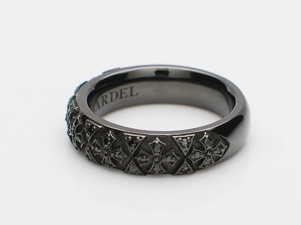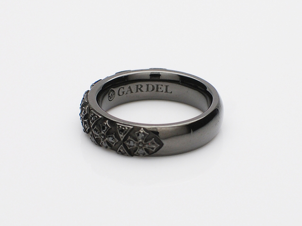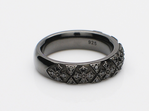 ◆クロスひとつひとつに4石のブラックキュービックジルコニアをセッティングし、さらにブラックロジュームをコーティングすることで、コントラストのあるブラックの輝きになります。