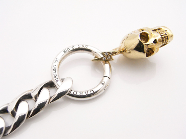 ◆チェーンの4コマめ、フック、さらには極小スカルの目にまでジルコニアを施すこだわりようで、手にとるだけで高揚感がわきます。