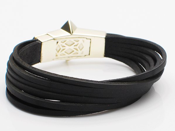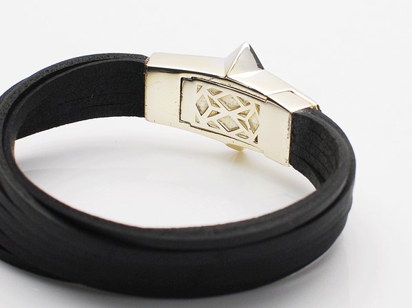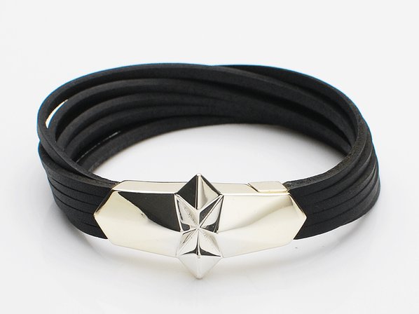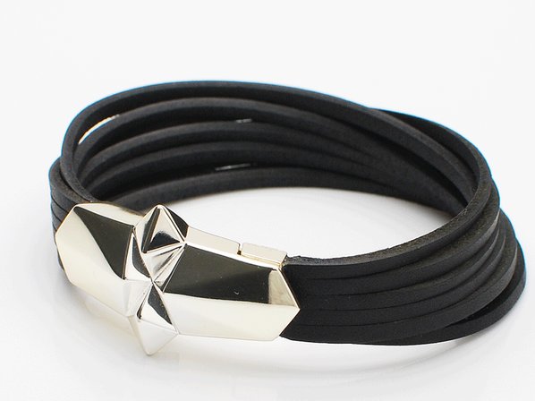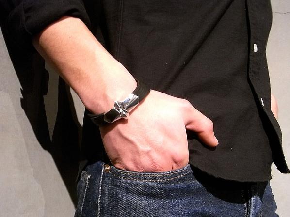 ◆欠片をイメージしたエッジの効いたモチーフに、カットしたレザーを組み合わせたモード感漂うブレスレットです。