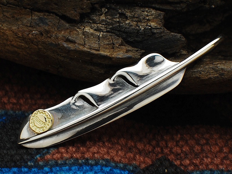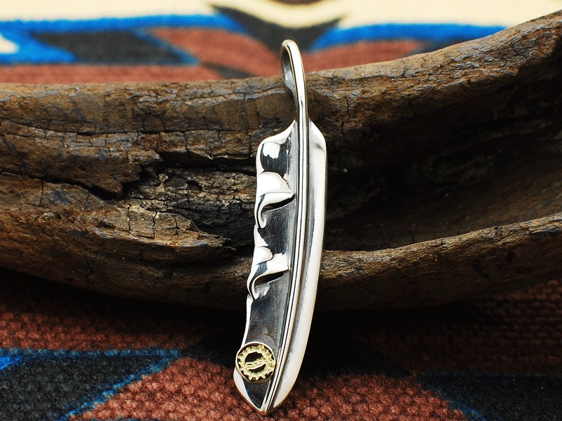 ◆デザイナーである正木氏が「キャンパスに見立てている」というフェザーは、使い込むほどに傷が入ることで、自分だけの味になり、初めて自分のものになるという、まさにネイティブ・スピリットらしいアイテムです。(縦:6cm/横:1.1cm)