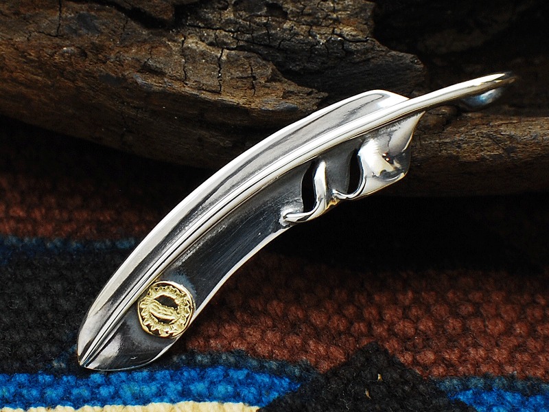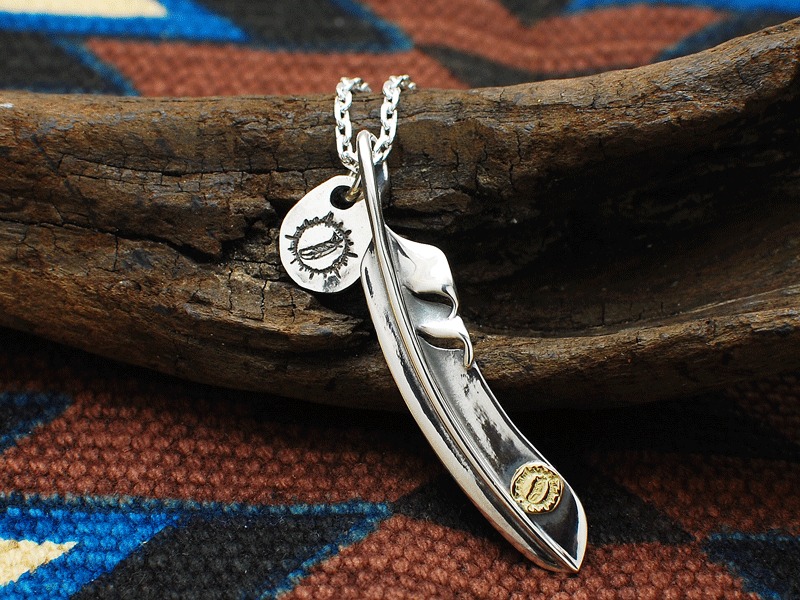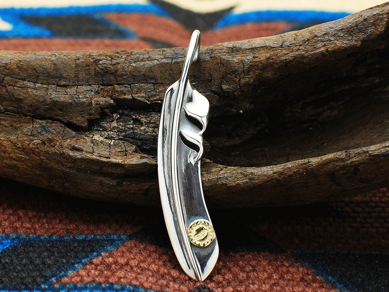 ◆デザイナーである正木氏が「キャンパスに見立てている」というフェザーは、使い込むほどに傷が入ることで、自分だけの味になり、初めて自分のものになるという、まさにネイティブ・スピリットらしいアイテムです。(縦:6cm/横:1.1cm)
