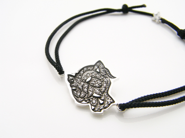 ◆”ホワイトタイガー”をラインどりと、キュービックジルコニアを敷き詰めることで”白”を表現した小ぶりですが迫力の表情が楽しめるブレスレットです。