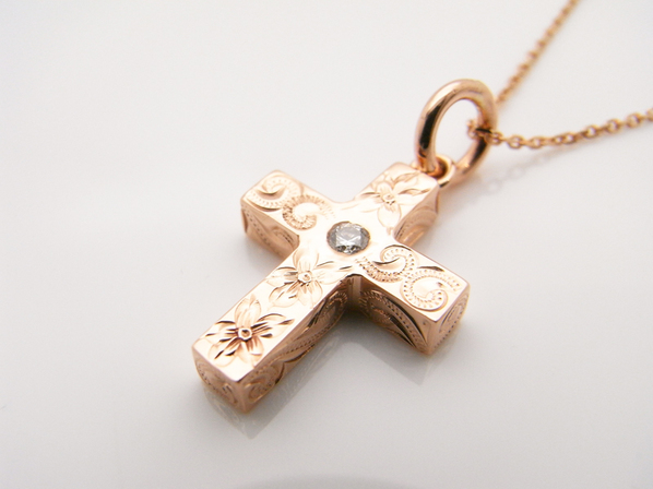 ◆誓い、信頼を意味するクロスに恋愛を象徴するお花「プルメリア」と、永遠に続く幸せを意味する波の模様が刻まれたペンダントヘッドです。