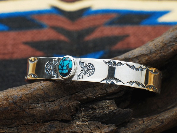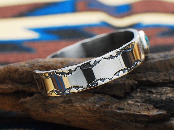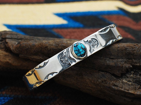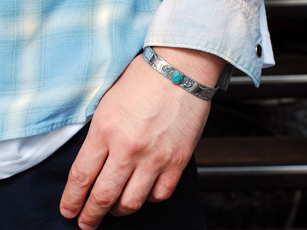 ◆厚みのあるシルバーバングルに、ひとつひとつスタンピングを施し中央にターコイズをセッティングしたNATIVE SPIRITらしいアイテムです。