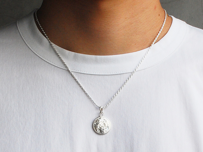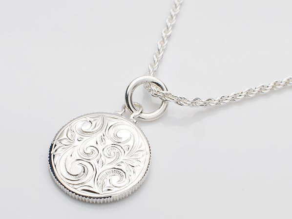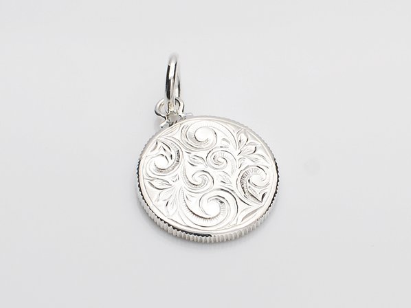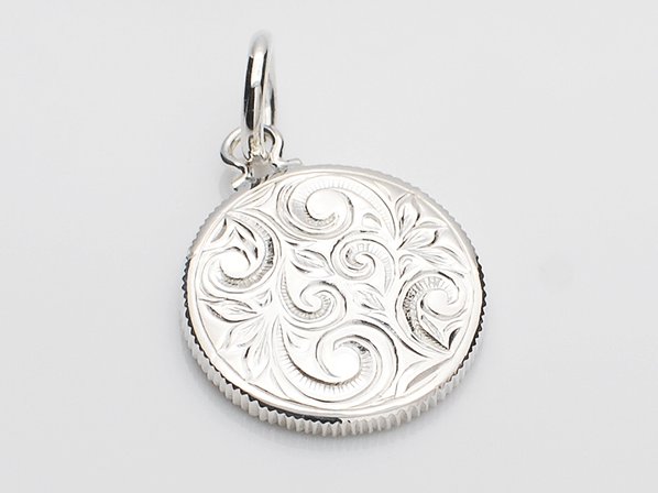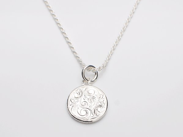 ◆永遠に続く幸せを意味するスクロール(波)と永遠の絆を意味するマイレリーフが彫り込まれたコイン型のペンダントヘッドです。
