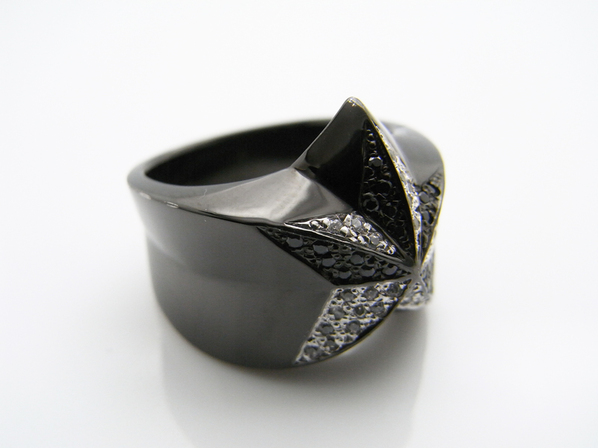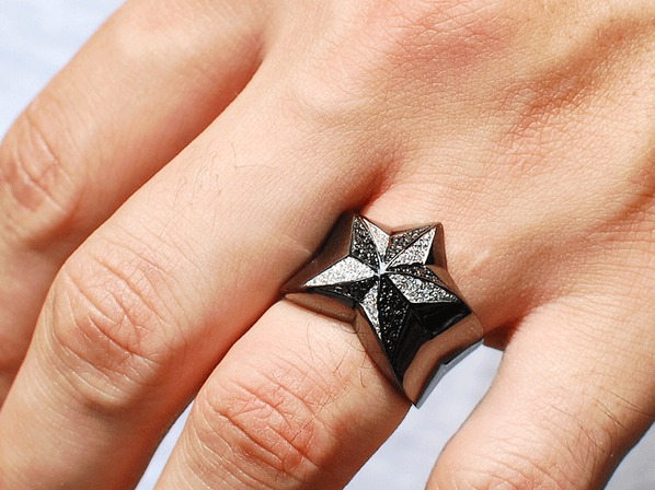 ◆キングリモの得意とする立体的な面使いと、キュービックジルコニアのパヴェセッティングを合わせたスターモチーフのリングです。