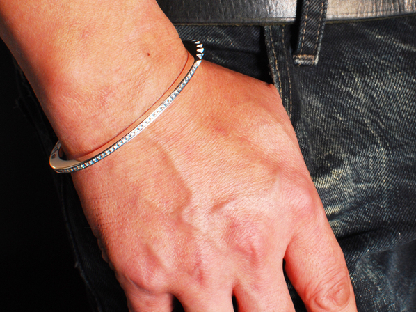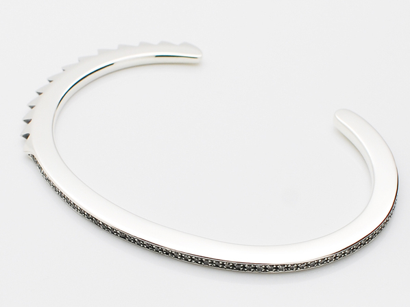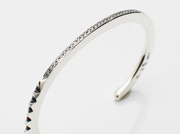 ◆ハンドカフ(手錠)をモチーフにバングルでは珍しいアシンメトリーのデザインに仕上げたアイテムで、ソリッド感を演出する細身のラインが存在感を放ちます。