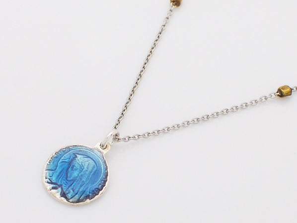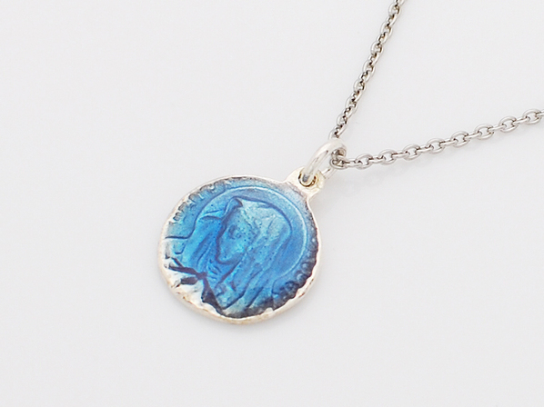 ◆マリアメダイにブルーのエポキシ樹脂を発色よくコーティングしたネックレスです。