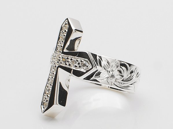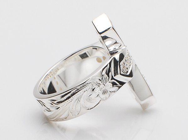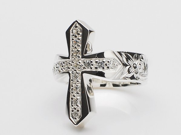 ◆誓い・信頼を意味するクロスに、キュービックジルコニアを丁寧にセッティングしたリングで、彫り模様には恋愛を象徴するお花「プルメリア」と、永遠に続く幸せを意味する「スクロール(波)」が刻まれています。