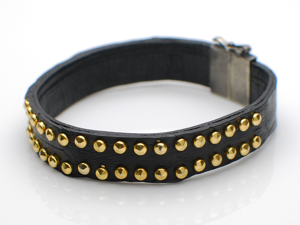 ◆クロコダイルレザーにBRASS(真鍮)のスタッズを打ち込んだ細身のレザーブレスレットで、重ね付けもお楽しみ頂けます。