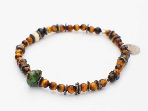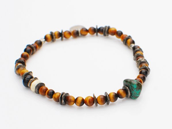 ◆タイガーアイを中心にターコイズ、リバーストーン、ブルータイガーアイを組み合わせた、数珠タイプのゴムブレスレットです。