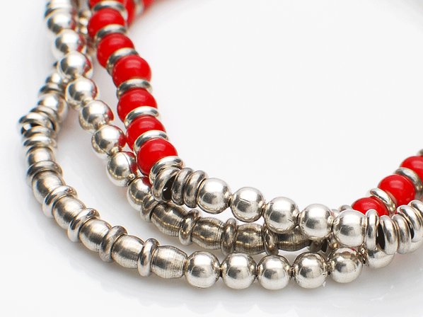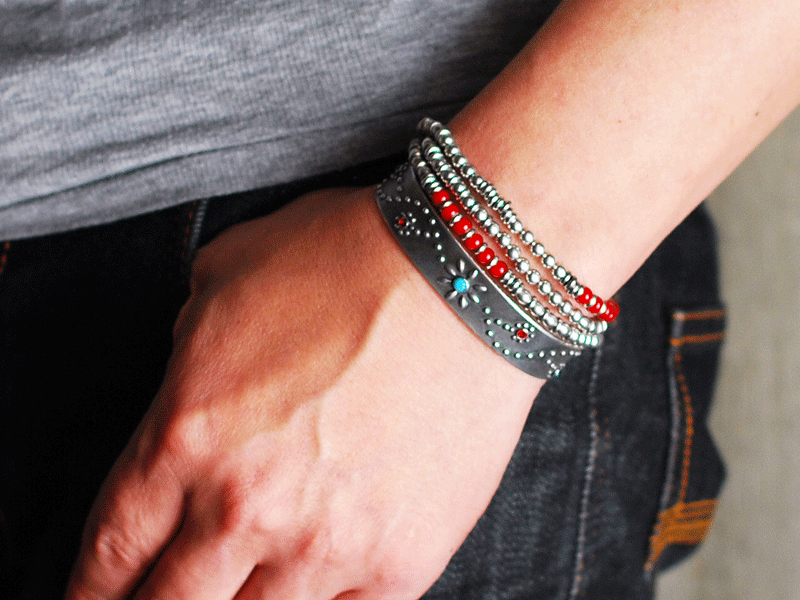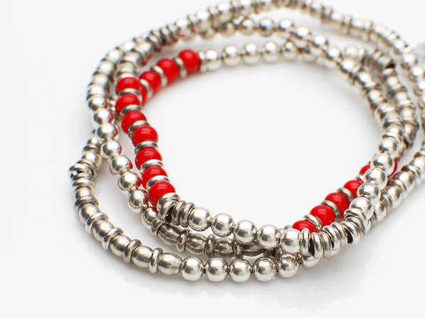 ◆発色のよいレッドのホワイトハーツとメタルビーズのチョーカーで、3重巻きでブレスレットとしてもお楽しみ頂けます。
