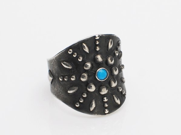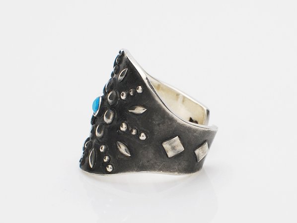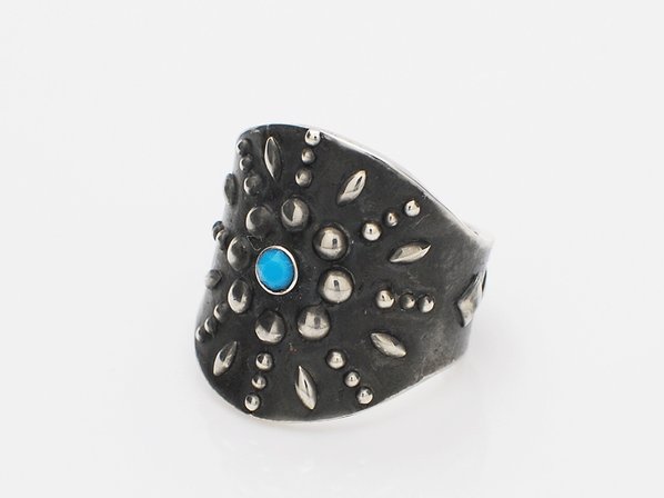 ◆中央にターコイズを施し放射状にスタッズを配した、真っ黒に燻し磨き上げたフリーサイズのリングです。