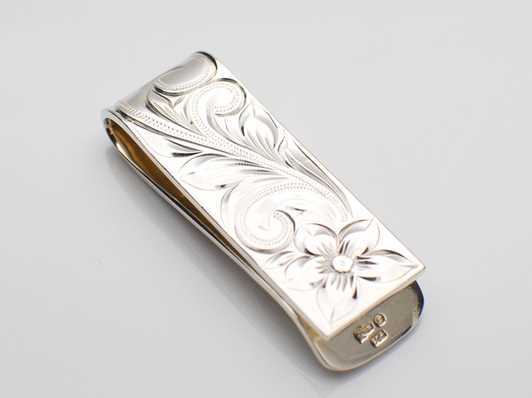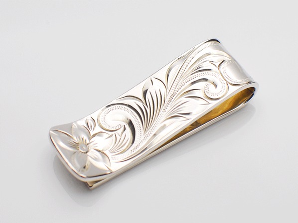 ◆表、裏、丁寧に彫られたプルメリアと波、リーフの模様が高級感を漂わせるマネークリップです。