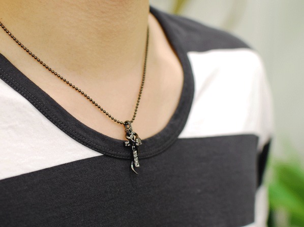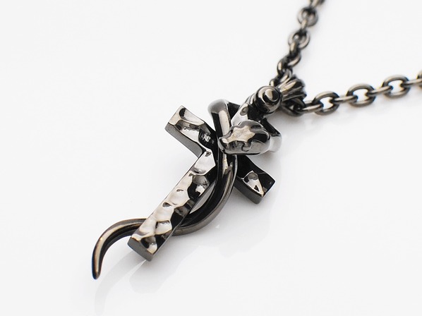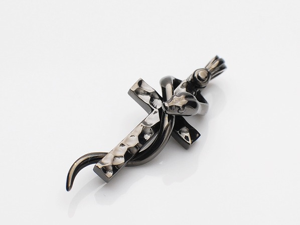 ◆その槌目加工のクロスにヘビを取り巻いた、ハンドメイドの温もりが感じられるペンダントです。