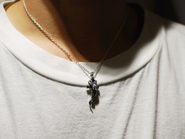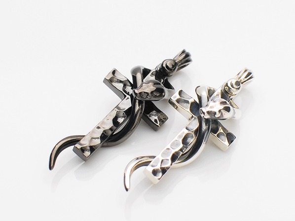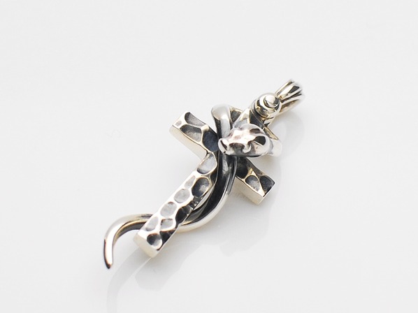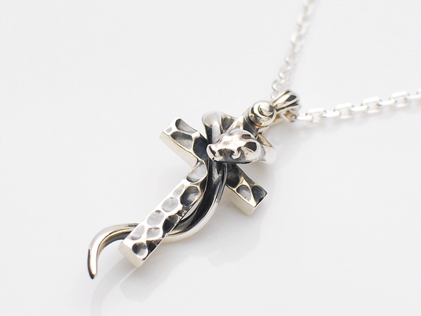 ◆その槌目加工のクロスにヘビを取り巻いた、ハンドメイドの温もりが感じられるペンダントです。
