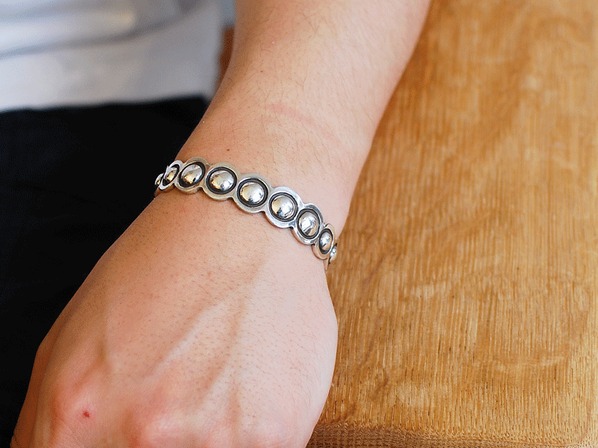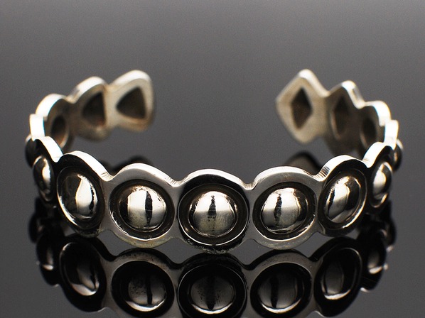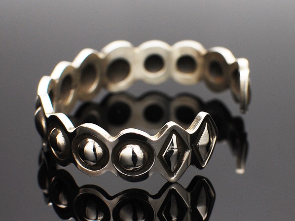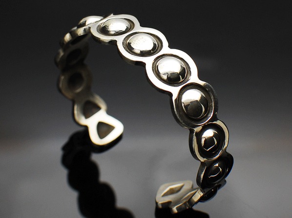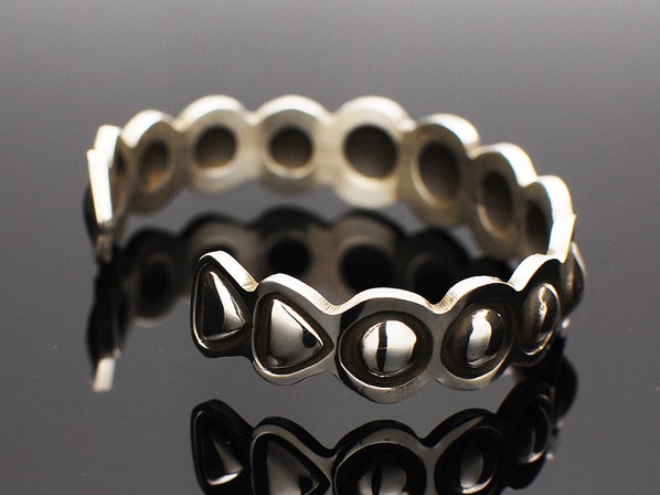 インディアンジュエリーのリボーズ技法(裏からシルバーを叩き出してデザインを作り上げる)でモダンに